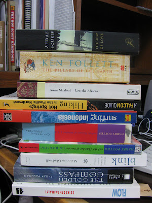 One way that Tokyo is different from Taiwan is the plentiful English language reading material. Initially, I bought books from Amazon or the occasional bookstore here and there, but then 4-5 months ago a Book Off opened down the street. They are a Japanese used book chain, but since our neighborhood is full of foreigners, it wasn't long before they had a sizeable English language section. Not as big as the English only bookstores, but generally newer books, more turnover, and much cheaper. Especially, for some reason, the English books, which I think the staff is not quite sure what to do with. Also, we soon discovered that one weekend a month the English books are half-off, (although the signs that advertise this are all in Japanese), which means that a lot of the paperbacks and kids books are only a dollar. So, for the first time, I started buying books as a consumption item. Anything you want to do in Tokyo costs. With transportation, food, admission fees, you're lucky if you can leave the house as a family for less than $30-$50. Movies cost $2o per person, or so I hear. Even hiking or going to the beach, usually considered free, will put you out $30 just getting there and back. So books seem like a great deal in comparison. Even if you are only going to read them once and then sell them back. It sort of feels like a pay library. Once I got a whole stack of kids books, so Miriam would have something to practice with. Although I have been the one who gets most of the practice. This is also how we have kept up with books to read Miriam at night. After all, we finish something every week or so, and so I have probably already read her 15-20 books. Anyway, so I went yesterday and here is my haul. The first four Harry Potter books, The Golden Compass by Philip Pullman, and By the Shores of Silver Lake by Laura Ingalls Wilder. I also go Tipping Point and Blink by Malcolm Gladwell, who writes for the New Yorker, which look interesting. All for $14. Last time I got Flow by Mihaly Czisentmihalyi, which I am now reading and enjoying. Other previous finds include Hiking and Hot Springs in the Pacific Northwest, Surfing Indonesia, and Fundamentals of Kayak Navigation for future adventures.